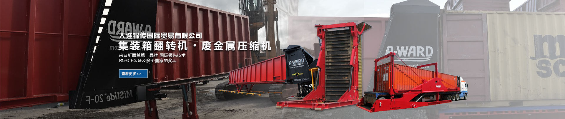 大連錦傳國(guó)際貿(mào)易有限公司于2013年11月與新西蘭A Ward公司達(dá)成戰(zhàn)略合作,成功代理集裝箱翻轉(zhuǎn)機(jī)、廢金屬壓縮機(jī)等產(chǎn)品在中國(guó)大陸的銷售、維護(hù)及保養(yǎng)業(yè)務(wù)。本公司重合同、守信用,保證產(chǎn)品質(zhì)量,以經(jīng)營(yíng)多種特色的產(chǎn)品和薄利多銷的原則,贏得了廣大客戶的信任與厚愛(ài)。現(xiàn)長(zhǎng)期出口產(chǎn)品至澳大利亞,巴西,德國(guó),俄羅斯,哥倫比亞,美國(guó),泰國(guó),羅馬尼亞,新西蘭 ,意大利,越南,印度,印度尼西亞等國(guó)家。